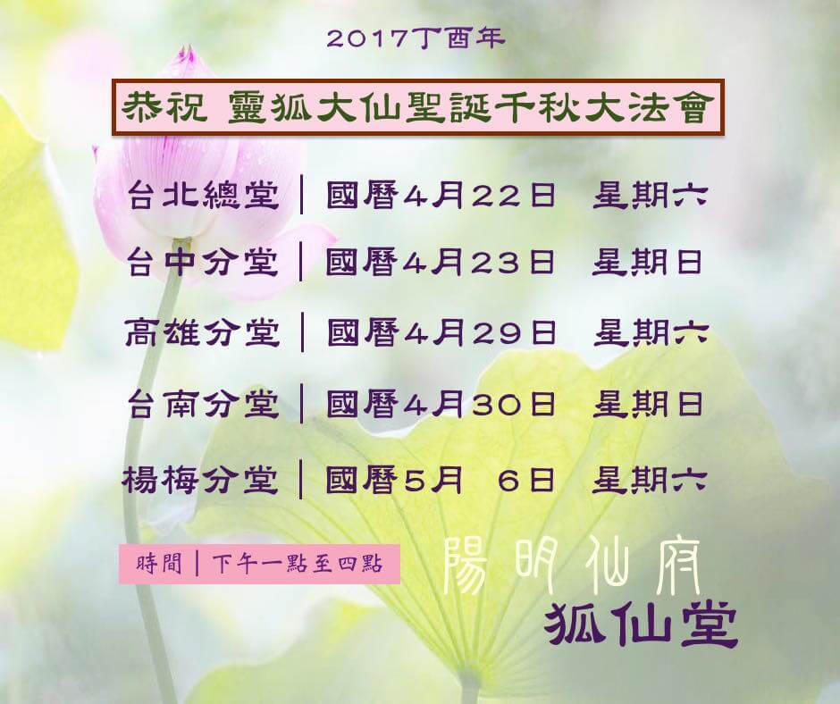 狐仙堂2017丁酉年靈狐大仙聖誕千秋大法會日期