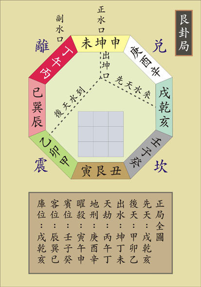 丑艮寅山未坤申向之正局須收戌乾亥方乾卦水之來謂之先天水,又收甲卯乙方震卦之水到謂之後天水,水來得長去得遠皆潤澤者謂之財丁兩全之水法,水出坤口由堂面直出者,主能出貴,先天水長來者主出丁興旺多賢,後天水長來者主發大財,若水由丁口〈副水口〉而出者主有多財丁少,出坤謂之正水口,正副有別則格局自然有差矣,天劫位在丙午丁方,地刑在庚酉辛位,曜殺在寅午申位,此局大凡收甲與乙之來水,又收戌乾亥方乾卦水接出坤口為最佳之局,坤位有聚大埤者為最上佳之局。